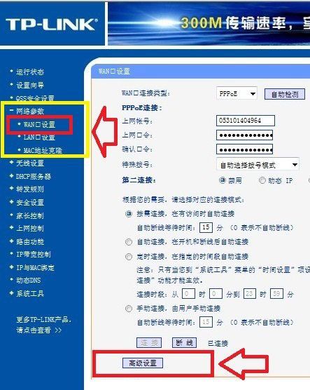 进入路由器设置界面后,然后我们再点击左侧“网络参数”展开更多设置,之后即可看到“WAN口设置”选项了,我们再点击左侧的WAN口设置,在WAN口设置界面底部还有一个“高级设置”入口,我们点击进入即可进入到路由器DNS设置界面了,如下图:
